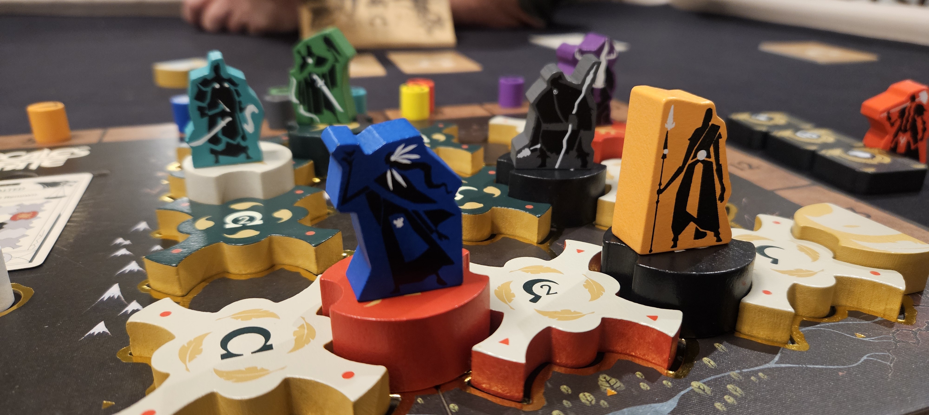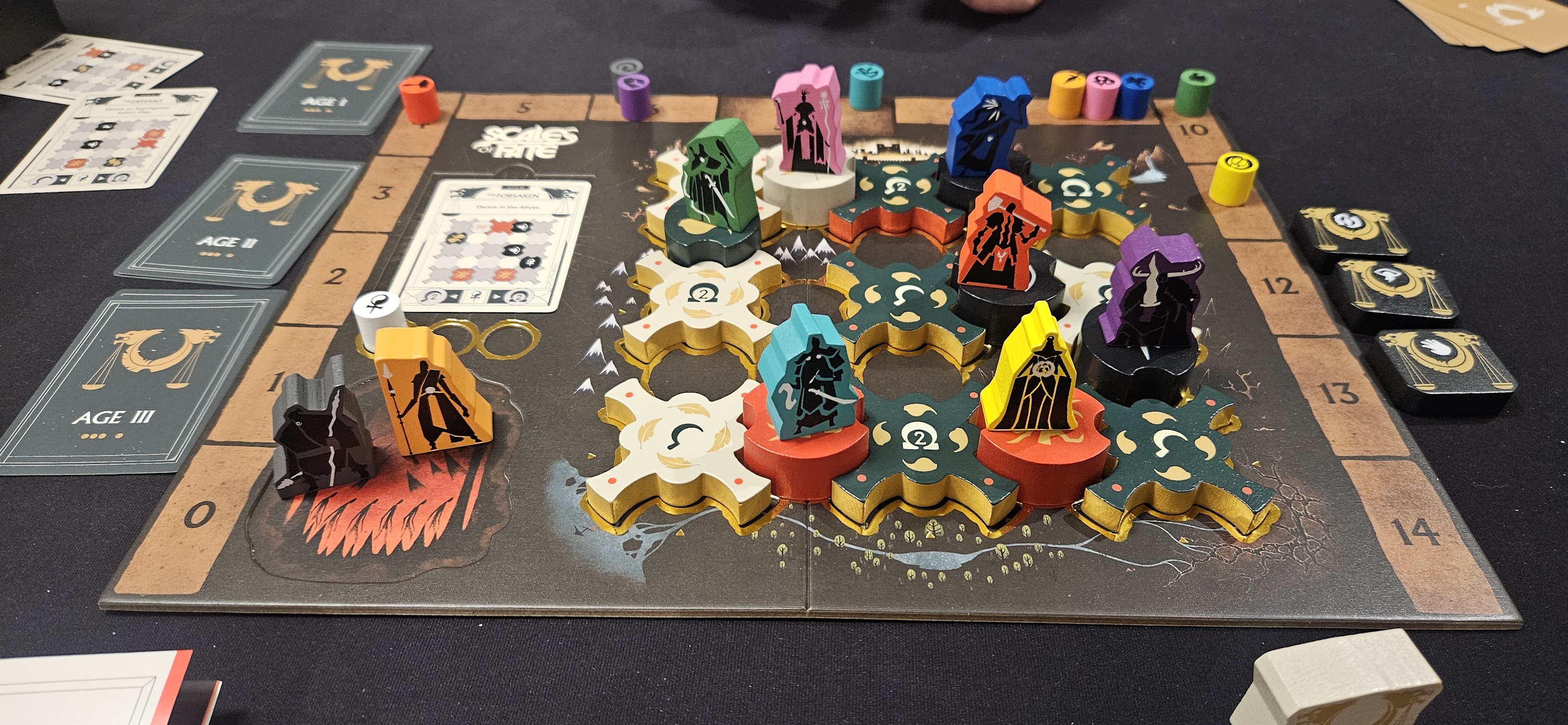 Crucially, these cards ask yes/no questions rather than demanding specifics. If you’re clever enough to ensure that only one of your two children meets the current age’s criterion, you can simply say “yes” to their presence without giving too much away. For example, one first-age card asks whether one of your children is still seated at four to six renown on the track. Saying yes is almost worse than saying no, especially if nearly all of the demigods have yet to make a name for themselves.