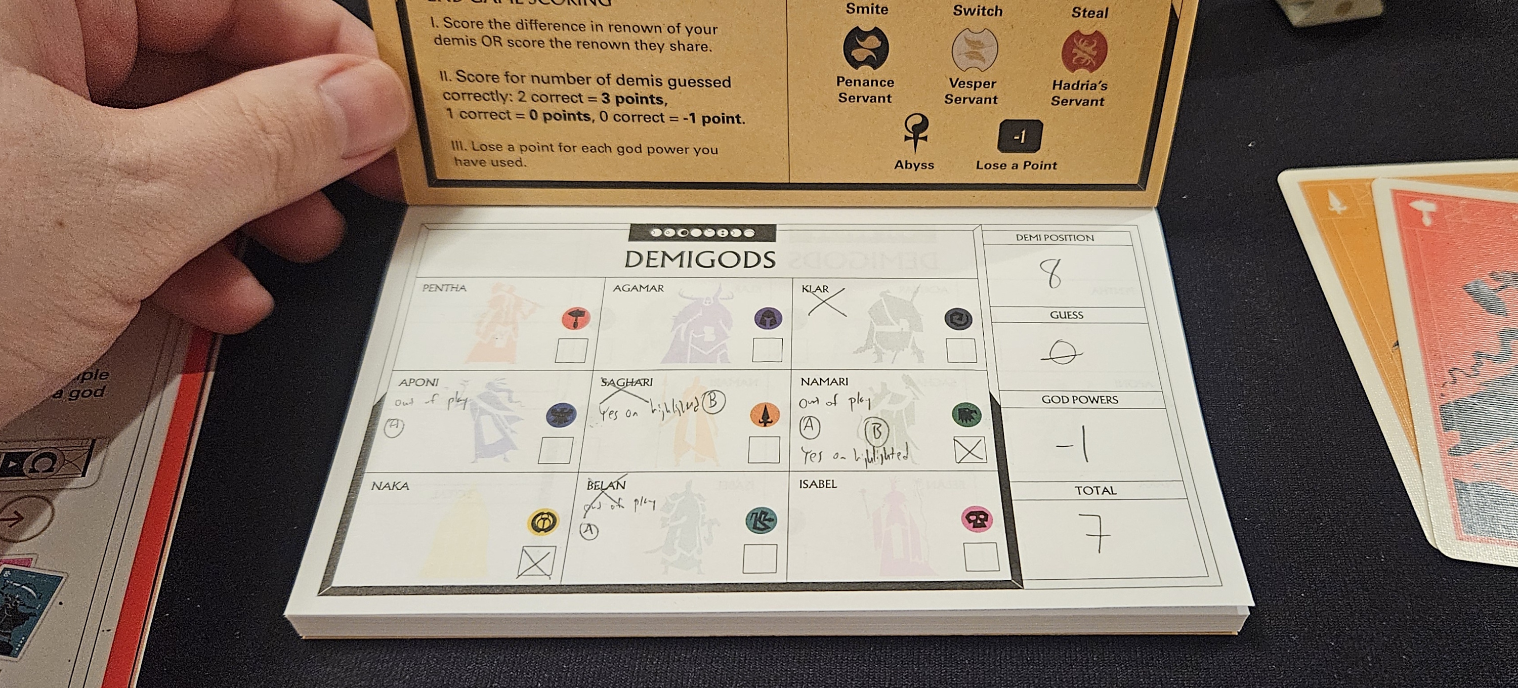 This introduces a wonderful sense of risk and reward to Scales of Fate, not to mention fixes my hangups with Veiled Fate. In that game, players earned points for ensuring their holy bastard earned the most renown. But that made their identity almost trivial. Once any one demigod got too hot for their britches, everyone would work together to take them down a peg. It was simple. Too simple.