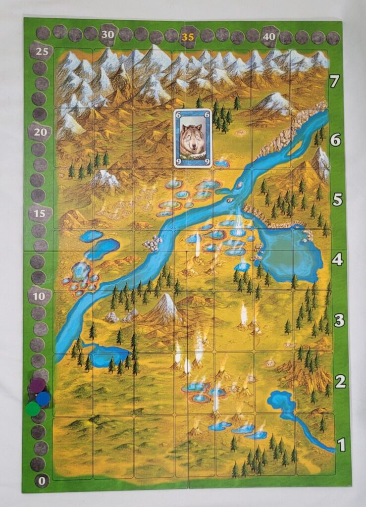 Yellowstone Park is played on a 7x7 grid laid on top of an illustrated overhead view of the titular park. The rows are numbered from 1 to 7 in ascending order, starting from the lowest row and moving upwards. There is a score track running along the left side of the grid. Each player’s score marker begins at the number 5 spot on this track.