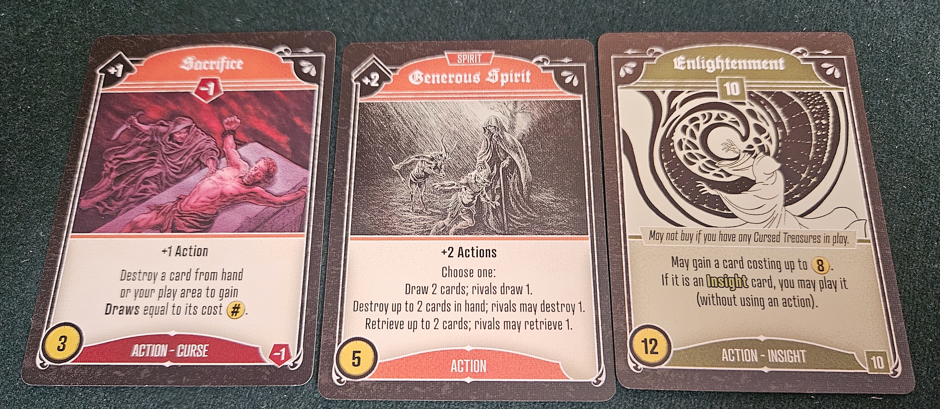For Lehmann-heads, dark pacts aren’t far off from the monuments and places of power in Res Arcana. It’s just that they’re hidden in the deck like your average demon-summoning ritual or cursed ring, get shuffled into your deck, and present conditions that let you win outright rather than offering spills of points. If their targets sound intimidating, that’s deliberate. When the game opens, most dark pacts are well out of reach. Especially, remember, because you only get one action per turn, five cards per draw phase, the usual limitations.